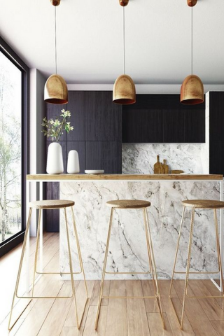 Grâce au marbre, vous pouvez sublimer votre cuisine et la rendre plus raffinée. Cette matière à la fois chic et lumineuse se marie à merveille avec des couleurs unies et des petites touches de doré ou cuivre pour la décoration.