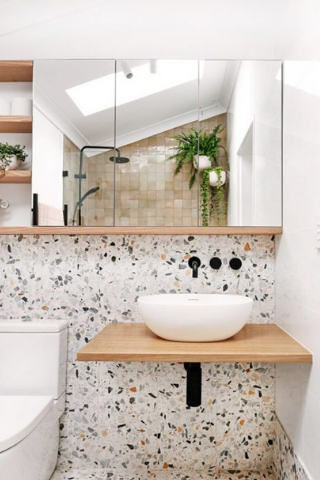 Le terrazzo est une matière constituée de marbre et de ciment teinté. Il apporte de la luminosité et du peps, surtout dans la salle de bain. Pour mettre en avant son potentiel, optez pour des couleurs pastel et une décoration légère et épurée.