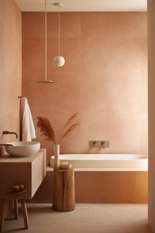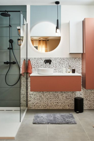 Rouge foncé (terracotta, burgundy), nuances orangées... les couleurs chaudes apportent une ambiance chaleureuse à votre salle de bain. Elles ajoutent de la profondeur et transforment votre salle de bain en un lieu particulièrement confortable et envoûtant.