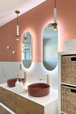 Finis le blanc monotone, cette année les couleurs audacieuses et créatives s’invitent dans votre salle de bain. Si vous préférez les couleurs froides, le vert olive et le vert sauge ont le vent en poupe. Elles offrent une touche de fraîcheur et créent une atmosphère apaisante.