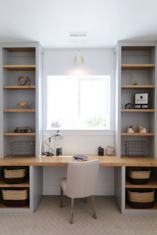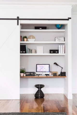 Un lieu de travail situé dans une niche ou un placard vous permettra de créer un espace bureau optimisé : l’ajout d’étagères murales sera très utile pour agrandir la surface de rangement.