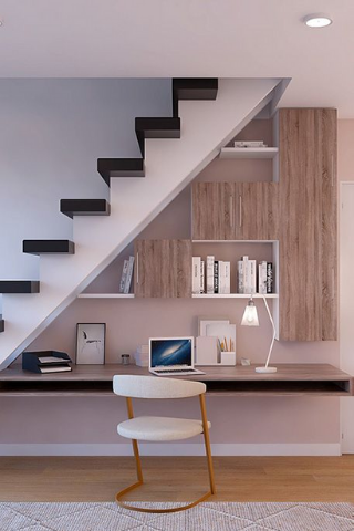 Si vous avez un escalier dont le dessous est inexploité, vous pouvez combler facilement cet espace en créant un coin bureau. Vous gagnerez de la place et un lieu de travail pratique et agréable qui apportera une touche d’originalité à votre logement.