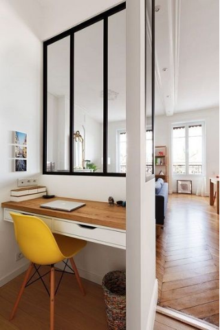 Si vous souhaitez réaliser un coin bureau à proximité de votre salon, vous pouvez aménager celui-ci en le séparant subtilement par une verrière. Un atout moderne considérable qui apportera une plus-value à votre salon.