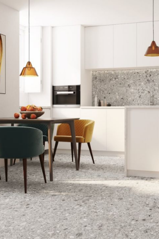 Le terrazzo mélange la pierre naturelle, le ciment et le marbre poli. Utilisé comme revêtement de sol et crédence, il sublime naturellement votre cuisine.