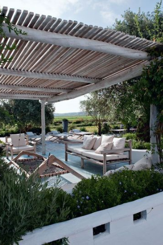 Il existe également des pergolas avec un toit en fibre naturelle, c’est une excellente idée pour apporter de l’ombre et créer un style bohème avec des éléments de décoration comme des plantes grasses et un éclairage feutré.