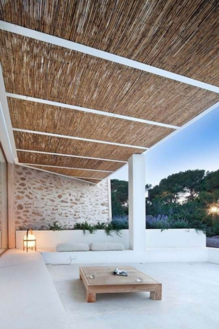 Pour créer un cocon naturel, vous pouvez choisir une pergola avec des canisses. C’est une excellente idée pour apporter de l’ombre et créer un style bohème avec des éléments de décoration comme des plantes grasses et un éclairage feutré.