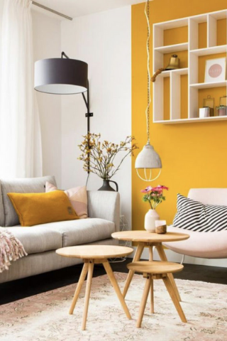 Pour apporter un peu de peps en gardant visuellement un grand espace, vous pouvez ajouter du papier-peint ou peindre un pan de mur. Pensez à utiliser également des accessoires en couleurs comme des vases, des coussins… Ces touches sont idéales pour délimiter l’espace et donner de la profondeur à votre pièce.