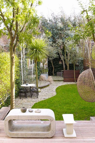 Un jardin moderne se compose davantage de minéraux et de bois. Pour les intégrer, vous pouvez réaliser une terrasse en bois et des allées en gravier. L’utilisation des mêmes matériaux entre l’intérieur et l’extérieur vous permet d’unifier l’ensemble de votre habitation.