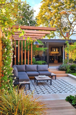 Les meubles de couleurs neutres sont parfaits pour donner un design contemporain. Afin que votre terrasse soit protégée des intempéries et du soleil, vous pouvez créer une pergola en aluminium ou en bois.