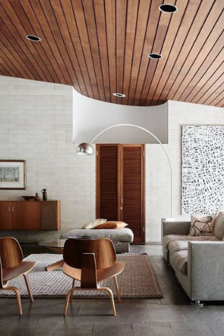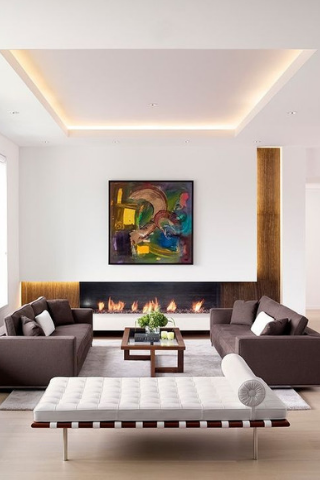 Pour un salon, un faux plafond suspendu est idéal pour pallier une hauteur superflue et transiter discrètement les réseaux d’électricité, d’eau et de chauffage. On peut aussi y insérer des spots lumineux.