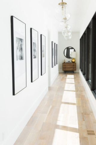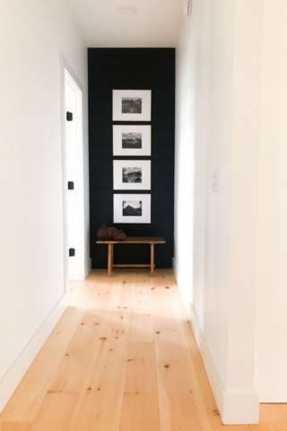 Si votre couloir manque de profondeur, l’idéal est d’opter pour une nuance foncée sur un pan de mur. Un classique, qui fonctionne à tous les coups. Vous pouvez également ajouter des cadres dans une teinte claire pour apporter une note contrastée et lumineuse à votre déco.
