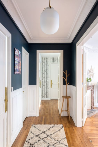 Contrairement aux idées reçues, la couleur est la bienvenue dans votre couloir. Placée de manière judicieuse, elle offre de nombreuses possibilités d’aménagement. Par exemple, si votre mur arbore des moulures, vous pouvez peindre la partie se situant au-dessus pour mettre en valeur la déco de votre intérieur.