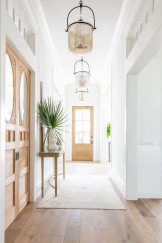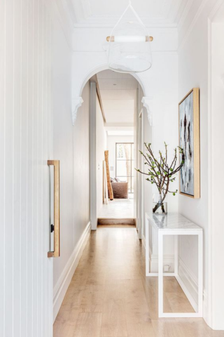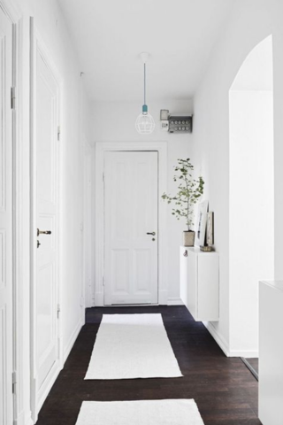 Dans un couloir aux nuances claires, on choisit un parquet plutôt foncé. C’est l’une des grandes astuces et tendances du moment pour agrandir visuellement l’espace.