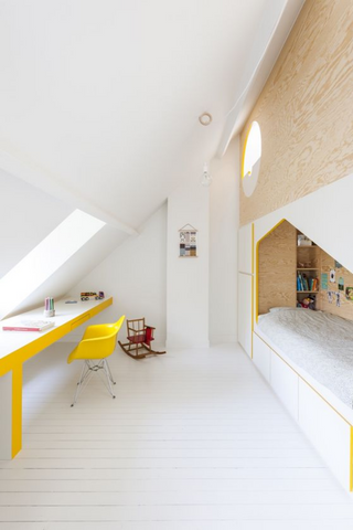 Du sol au plafond, les nuances claires sont parfaites pour illuminer votre chambre mansardée. Pour dynamiser davantage votre décoration, pensez à ajouter des petites touches de couleurs.