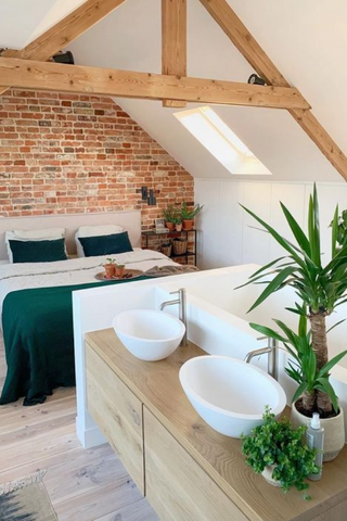 Lieu intimiste et cocooning, les combles se prêtent parfaitement à la création d’une suite parentale. Baignoire, douche à l’italienne, double vasque, lit king size… vous avez toutes les cartes en main pour créer une atmosphère calme et apaisante.