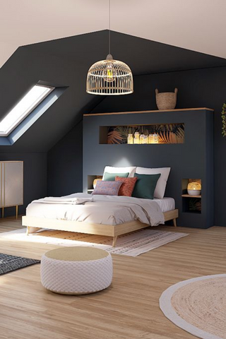 Souvent, les combles nous paraissent longues et aussi très étroites. Pour structurer l’espace, vous pouvez peindre un pan de mur dans une nuance plus claire ou plus foncée.