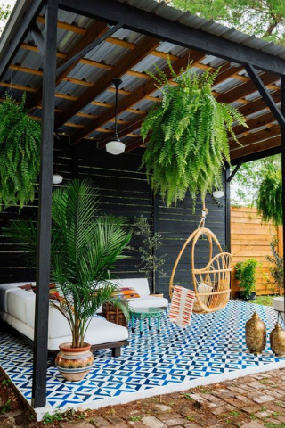 Il en existe également avec un toit en fibre naturelle, c’est une excellente idée pour apporter de l’ombre et créer un style bohème avec des éléments de décoration comme des plantes grasses et un éclairage feutré.
