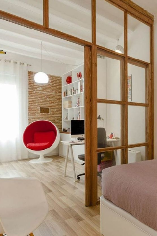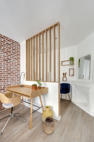 Pour aménager votre pièce, vous pouvez ajouter un bureau surmonté par une verrière en bois. Afin d’optimiser au maximum l’espace, pensez à ajouter des rangements sur les côtés.