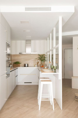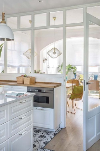 Afin de bénéficier d’une belle luminosité et de cloisonner l’espace, vous pouvez ajouter une porte à votre verrière. Pour une cuisine dans le style Scandinave, pensez à peindre celle-ci dans une nuance claire.