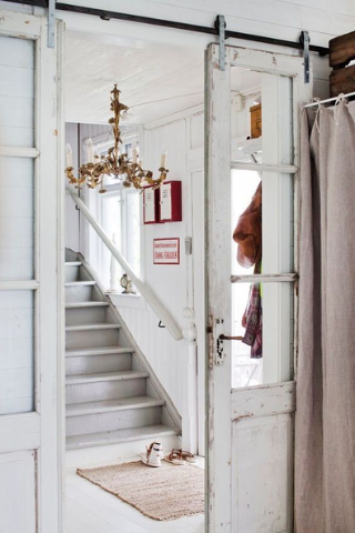 La tendance à l’upcycling déco, nous amène à récupérer des anciennes portes-fenêtres en bois patiné pour les transformer en verrière. C’est une excellente solution pour délimiter le couloir d’une pièce de vie et faire entrer la lumière dans celle-ci sans créer une séparation brutale.