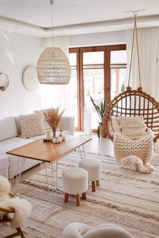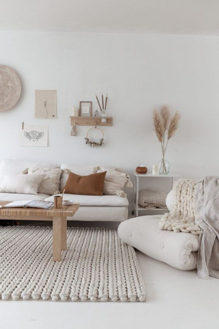 Plaids, coussins et tapis sont à l’honneur! Vous pouvez également mélanger les matières et les motifs (macramé, laine, pompons..) pour une déco plus dynamique.