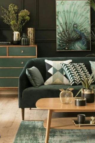 Pour un intérieur harmonieux, il est essentiel de comprendre ces différents termes. Le salon ci-dessous fait référence à la couleur verte, dans une nuance vert sapin d’intensité forte. Afin de créer davantage de contraste, vous pouvez choisir une teinte chaude pour le mur puis opter pour un sol clair.