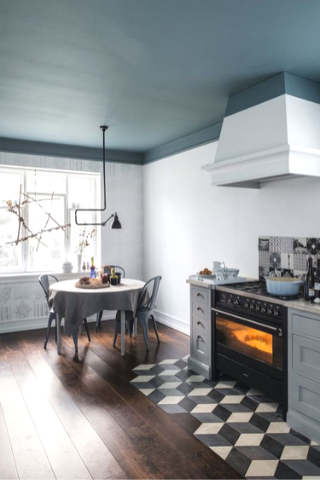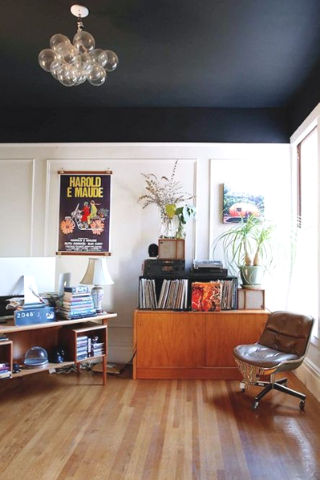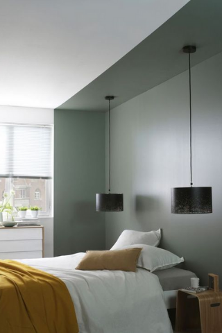 Parfois le plafond est trop haut et cela donne une impression d’espace inutile. Afin d'abaisser visuellement celui-ci, vous pouvez opter pour une couleur sombre et une teinte claire pour les murs et le sol.