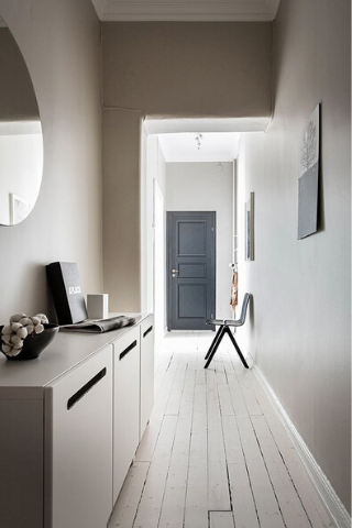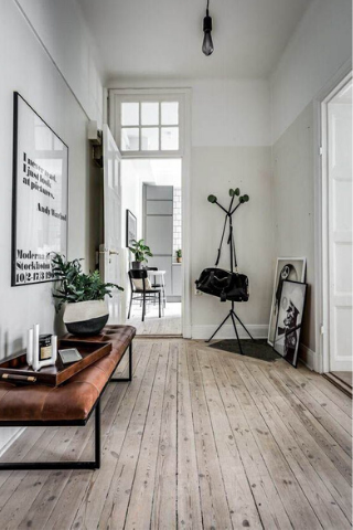 Brut ou peint en blanc, le parquet illumine l’entrée et donne un air resplendissant à cette zone d’habitude négligée et souvent inexpressive.