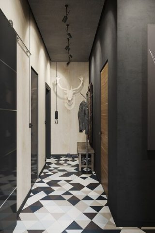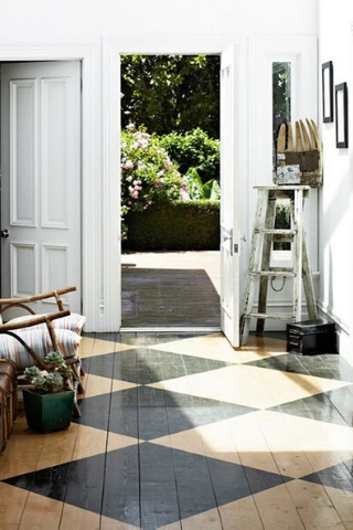 Très beaux et convivials, les motifs peints sur parquet sont une excellente idée pour un sol très expressif. Très rarement sollicité, ce type de sol distrait le visiteur et lui permet ainsi d’oublier la taille de l’entrée pour se focaliser sur l’expression graphique du sol qui bercera son regard.