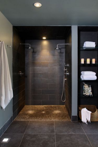 Cette nouvelle tendance de douche italienne duo, est de plus en plus prisée. Elle est idéale pour les romantiques qui aiment passer chaque moment de leur vie ensemble. L’aménagement de cette salle de bain peut être davantage moderne avec un carrelage avec effet béton et un receveur double en bois ou galets; ce qui crée un effet authentique et moderne à la fois .
