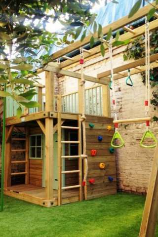 Les enfants adorent se divertir au grand air ! Pourquoi ne pas leur créer une aire de jeux sympa qui s'associera parfaitement à votre déco ? Vous pouvez ainsi aménager cet espace avec des éléments en matériaux naturels : un bac à sable, un tipi, des jeux en bois, une cabane en bois...