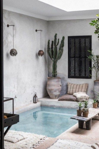 N’hésitez pas à pousser l’effet riad marocain en aménageant à côté un salon de jardin composé de coussins au sol, de plantes grasses et exotiques pour une déco 100% cocooning avec une ambiance mille et une nuits.