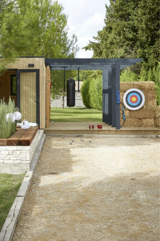 Vous pouvez également créer une petite salle de sport pour vos entraînements personnels ou pour jouer en famille ou entres amis : un jeu de fléchettes, un terrain de pétanque, un sac de frappe, et même un vélo elliptique. Tant de possibilités s'offrent à vous pour rendre vos moments à l'extérieur plus divertissants.