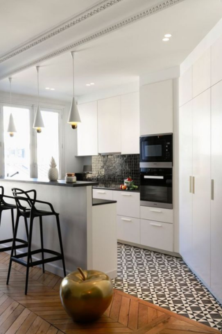 L’association des carreaux de ciment avec un parquet massif apporte un certain cachet à votre intérieur. C’est l’idéal pour délimiter une cuisine ouverte sur le salon.