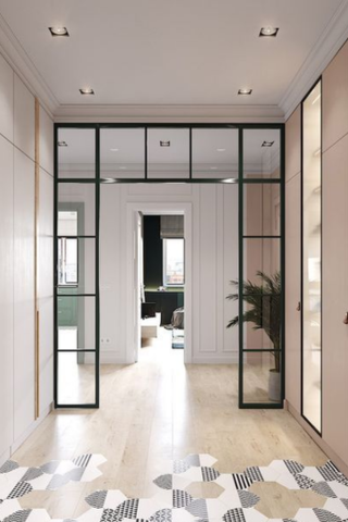 Dans cette entrée, le carrelage s’estompe rapidement et laisse sa place à un parquet clair. Vous pouvez ajouter une grande verrière, elle vous permettra de délimiter davantage l’espace.