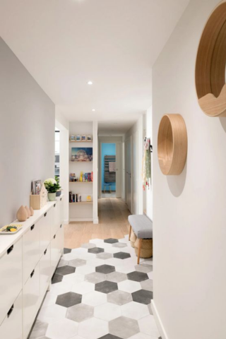 Pour séparer l’entrée de votre salon, vous pouvez opter pour un carrelage hexagonal. Très tendance, il se marie parfaitement avec un parquet clair.