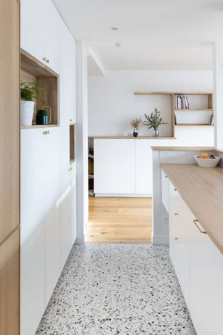Très tendance, le terrazzo se mêle au parquet pour créer une décoration moderne. Pensez à adopter ces deux revêtements pour un intérieur lumineux.