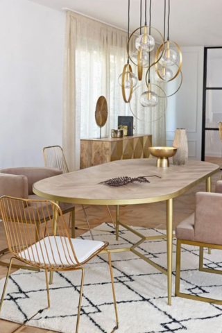 Le laiton s’invite dans votre salle à manger. Présent sur les meubles, accessoires et luminaires, il offre une déco dorée subtile et raffinée.