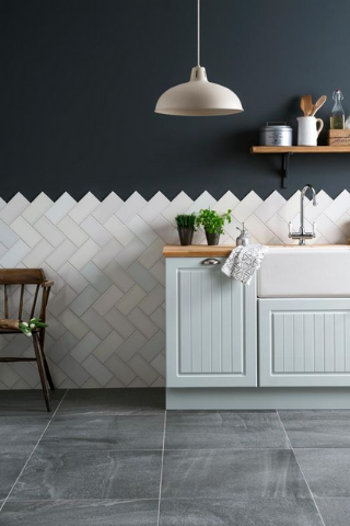 Les formes géométriques seront aussi de la partie avec des carrelages en forme d’écailles, de losange ou des poses en chevron pour moderniser et apporter du dynamisme à la pièce.