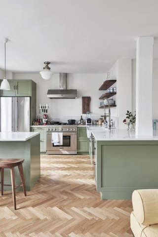 Dans les pièces comme la salle de bain ou la cuisine, on privilégiera des couleurs plus froides mais tout aussi chaleureuses comme le bleu foncé ou le vert olive.