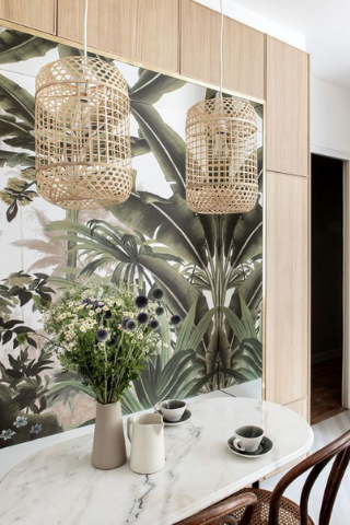 On pourra incorporer la nature à travers des tableaux aux images naturels ou des papiers-peints avec des motifs tropicaux qui inviteront à l’évasion et apporteront une touche d’exotisme.