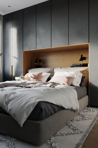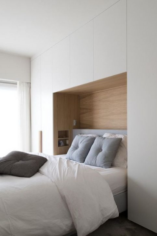Vous pouvez investir le mur au dessus de votre tête de lit et créer un espace dressing du sol au plafond. Cet agencement vous permettra un gain de place non-négligeable.