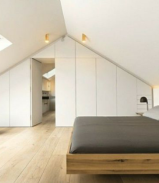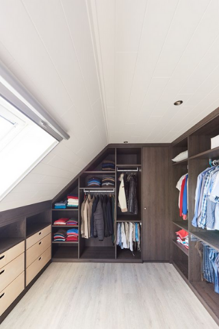 Si vous souhaitez aménager un dressing sous les combles, n’hésitez pas à exploiter la sous-pente. Cela permettra à cet espace peu accessible d'être optimisé.