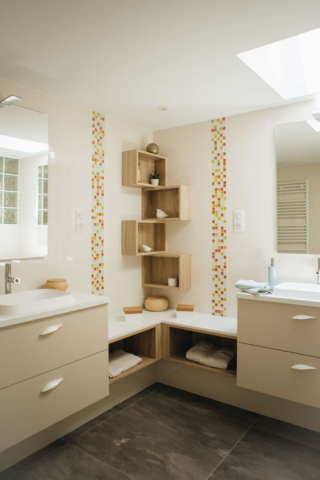 Dans la salle de bain, il peut être très utile pour créer davantage de rangements. L’idéal est de choisir un meuble sur mesure afin que celui-ci épouse parfaitement les contours de votre pièce.