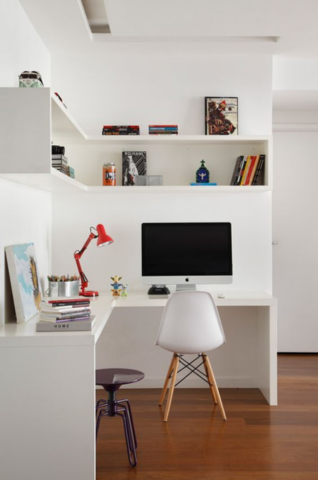 Pour créer votre bureau dans un angle perdu, vous pouvez ajouter des étagères et des rangements muraux.