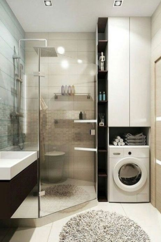 Si vous n’avez pas la place d’avoir une buanderie, vous pouvez installer celle-ci dans une pièce d’eau. L’angle perdu de votre salle de bain ou de vos toilettes sera idéal pour créer un rangement et ajouter un lave-linge.