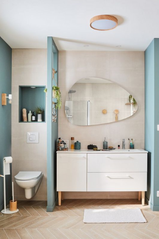 Souvent, ce mur a une double fonction, il sert notamment à l'espace douche. Pour qu'il soit davantage de praticité, on peut aussi y ajouter des niches afin de pouvoir profiter de rangements fonctionnels.