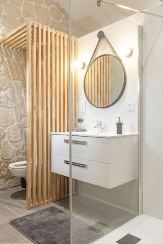 Le claustra en bois permet de marquer visuellement la séparation entre les WC et le reste de la salle de bain.