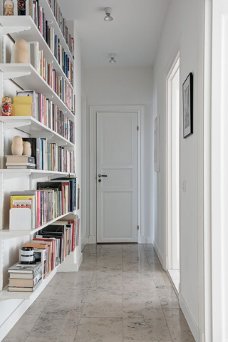 Tout comme le dressing, vous pouvez aussi penser à la bibliothèque dans votre couloir. Vous pouvez créer des niches afin d’intégrer directement les rangements aux murs.