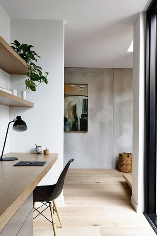 Pour jouer à fond la carte de l’esthétisme, n’hésitez pas à délimiter le coin bureau dans votre couloir en optant pour une bande de peinture plus foncée que le reste de la pièce.